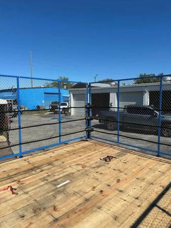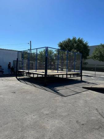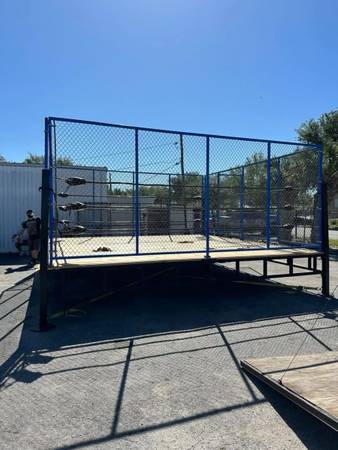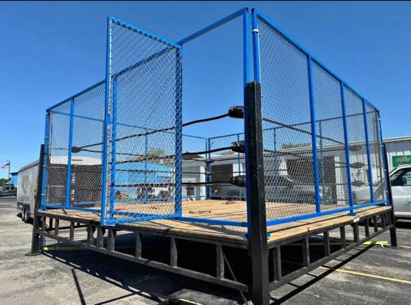 18'W x 7'T cage designed for 18' professional wrestling ring on dual axle transport trailer. Completely refurbished. 18' wrestling ring also available for sale. 2 additional panels go with it for a dual ring setup! Bill of sale with trailer!