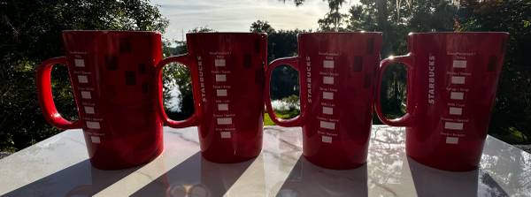 Set of 4 Starbucks coffee Mugs. Never used. Any questions please text , cash only, no shipping, & will deliver free in a certain radius.