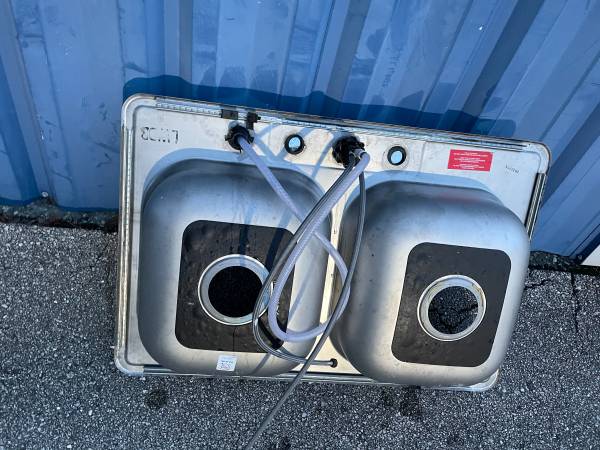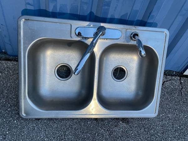 Kitchen Sink -( double basin, stainless steel, comes with faucet and water hose )- used good/fair condition as seen photos, measured size: 33"x 22"x 5"in deep, asking $35.00 please call or text:
