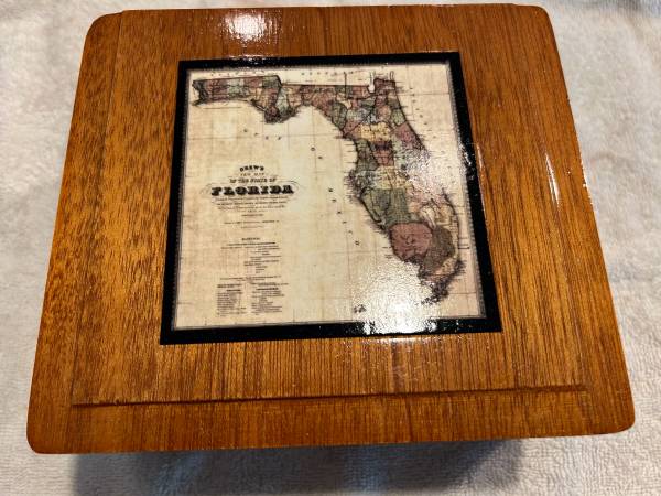 For sale is a Mahoghany box featuring Old Florida Map measuring 6.5 x 6.5 and 4 inches deep. The box has a factory finish and is made with a wooden hinge. The material to make the box is reclaimed and repurposed. The box comes from a pet/virus/smoke free home. Willing to meet in public place on the island. Cash only. TY