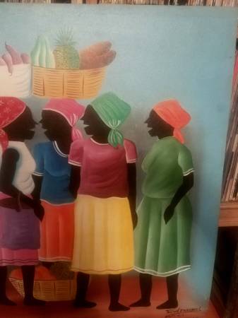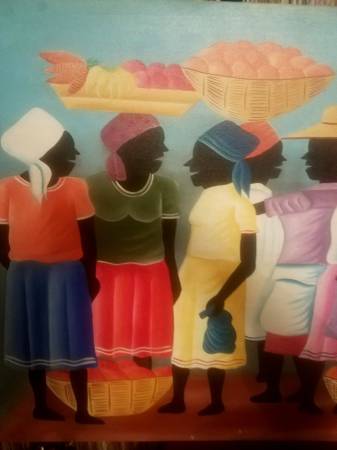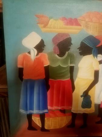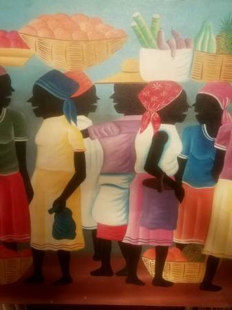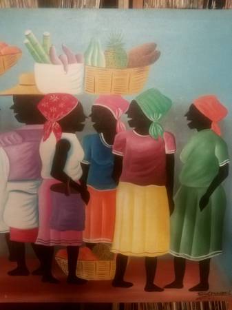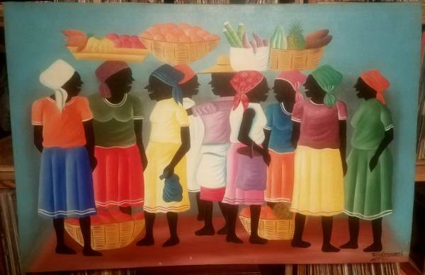 Very colorful painting by Haitian Artist Telfort Emmanuel. 36 inches wide X 24 inches tall.