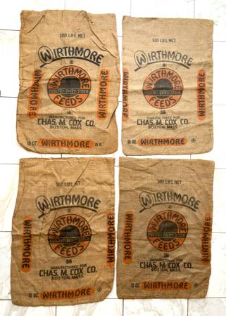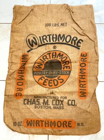 For sale are 1, 2, 3, 4, or more Antique/Vintage, High Quality, Made in the USA! (NOT China), WIRTHMORE FEEDS (Manufactured for Chas. M. Cox Co. Boston, Mass.) Burlap Feed Bags/Sacks . . . As pictured these wonderful old sacks remain in EXCELLENT condition all these years later! The Graphics and Colors are crisp with very little fading and there are no tears or holes and the bags! These sacks are all intact, relatively clean with no stains after ~75 years, and they have the wonderful (in my mind 😊) smell of an old haymow that transports you to the barn, no matter where you are! These will look great hanging (framed or not) in your barn, your store, your restaurant, your bar, etc., etc. These are also great for crafts, vintage reupholstery, sack races at your picnic/family get-together, etc. These bags, in this condition, are a STEAL at only $10 each, or 4 for $35! Contact us soon and come pick them up 😊 We're in Mandarin at the intersection of Beauclerc Rd. and Scott Mill Rd. (just off San Jose Blvd. near Goodby's Creek) . . . Cash only please. Thanks for looking!