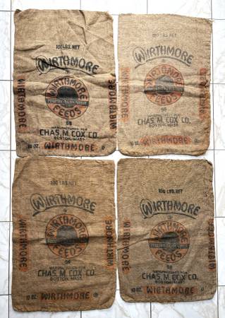 For sale are 2, 4, or more Antique/Vintage, High Quality, Made in the USA! (NOT China), WIRTHMORE FEEDS (Manufactured for Chas. M. Cox Co. Boston, Mass.) Burlap Feed Bags/Sacks . . . As pictured these wonderful old sacks remain in good condition all these years later! The bags are intact, the graphics and colors are very readable, they have minor fading and wear from use, they are relatively clean after ~75 years, and they have the wonderful (in my mind 😊) smell of an old haymow that transports you to the barn, no matter where you are! These will look great hanging (framed or not) in your barn, your store, your restaurant, your bar, etc., etc. These are also great for crafts, vintage reupholstery, sack races at your picnic/family get-together, etc. These bags are a STEAL at only 2 for $20 or 4 for $30! Contact us soon and come pick them up 😊 We're in Mandarin at the intersection of Beauclerc Rd. and Scott Mill Rd. (just off San Jose Blvd. near Goodby's Creek) . . . Cash only please. Thanks for looking!