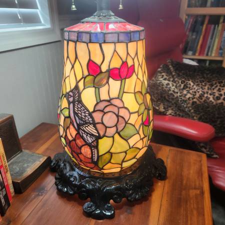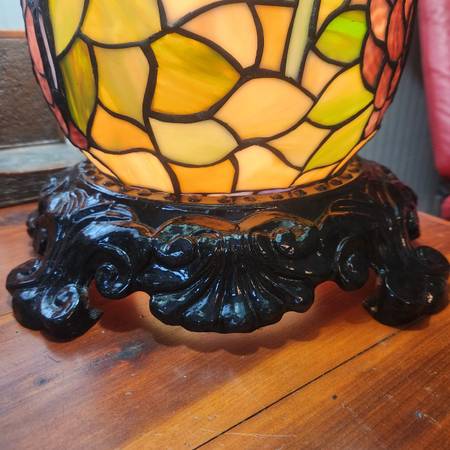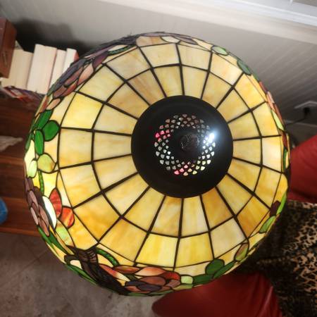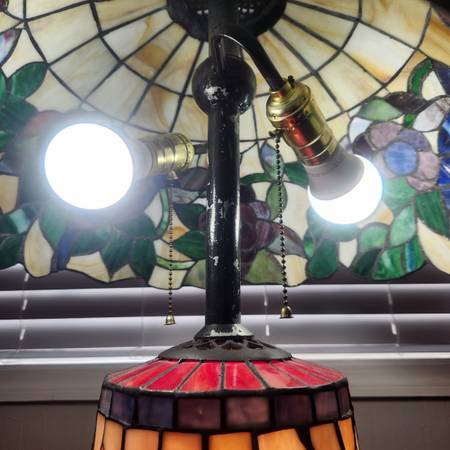 Antique Tiffany Style Stained Glass Lamp 2 Lights Under Shade Base Lights With Separate Control 29 Inches Tall 12.5 Inches Across Base 10 Inches At Widest Part Of Glass Base Shades Is 19 Inches...