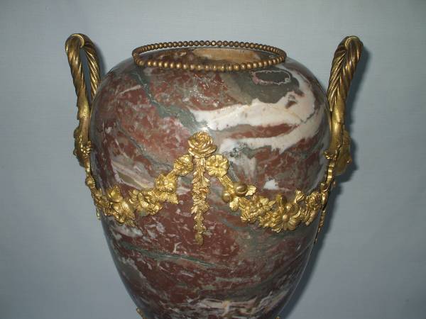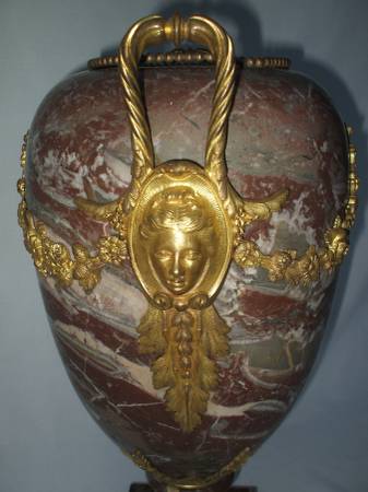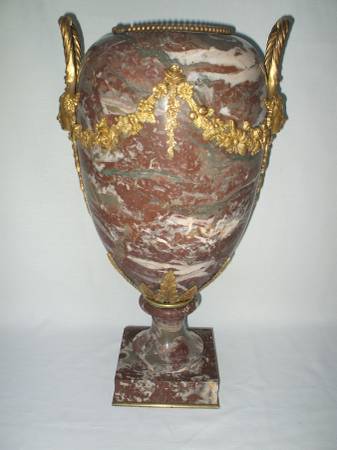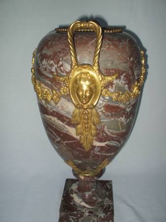 massive antique pink Full marble and gilt ormolu bronze urn, original French piece . WEIGHT 80 lbs. height 21 inch name and phone # ( good time to call ) gets reply