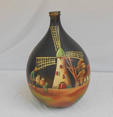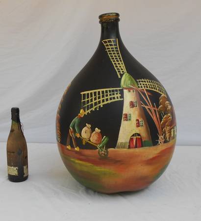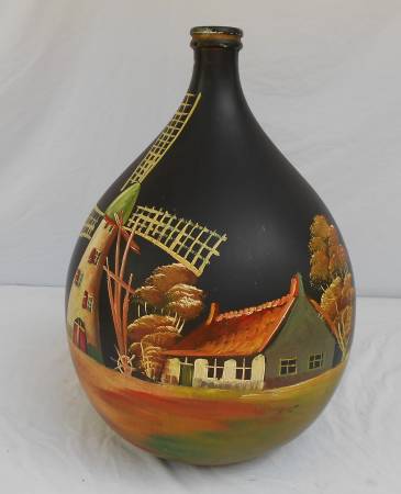 Flemish artist hand pain ted windmill Dutch farm country scene on Antique XL French Glass Demijohn ( i think a 30 Liter ). Bottle.