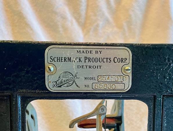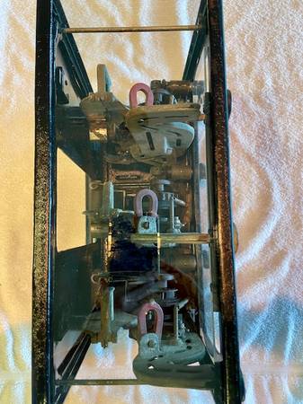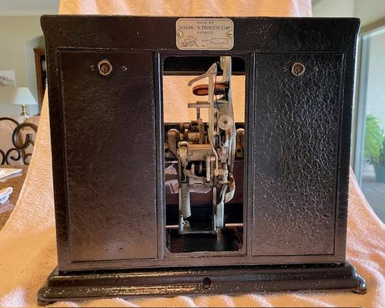 This is an antique 1930s vintage Schermack postage stamp vending machine. It is the hard to find 3 column offering 3 selection choices. All three mechanisms work; one on a dime and two take nickels. On center mechanism, about 1 inch is broken off stamp guide rail, part is included and should be easy reattached with right epoxy. The base, front and back are cast iron; top and sides are glass. The front windows are plexiglass; lower window shows original advertisement/instruction card which is faded, dirty and left end is torn off. Two back doors keyed alike with one key included. Missing one back door and cash trays used to collect coins at bottom. Approx 16x7.5x13 inches. Heavy.
