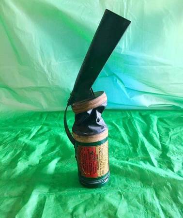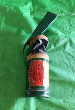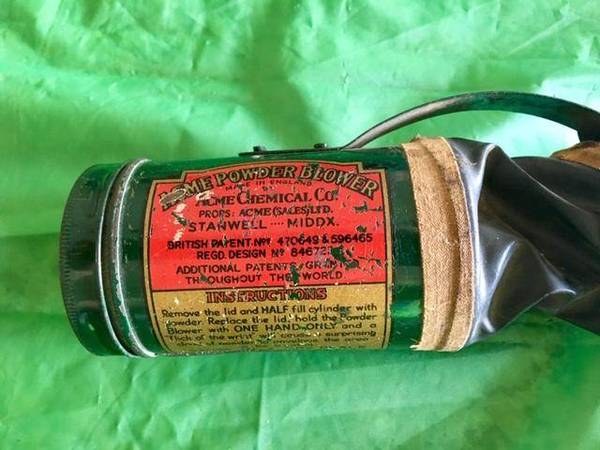 Acme Powder Blower; made in England by the Acme Chemical Company; hand garden duster; nice advertising decal with instructions for use on side; decal is scratched, but readable; approx 12 inches tall, 2.5 inch diameter; nice patina, scratches, dings and light corrosion from use; paint is good, bellows appear intact, appears to work; displays nicely.