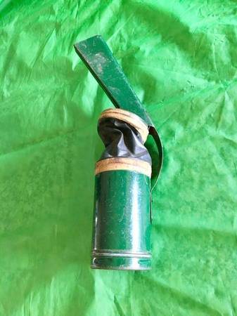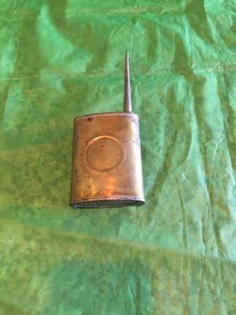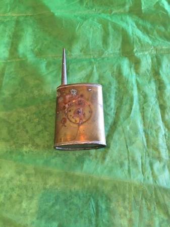Oil can with spout; I think it’s brass or copper; approx 2.5x6 inches tall; one side has heavy discoloration/corrosion, the other side has some discoloration/corrosion and would still display nicely.