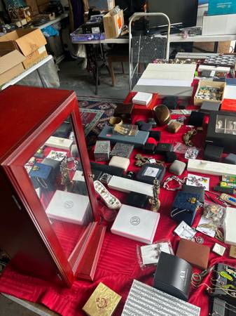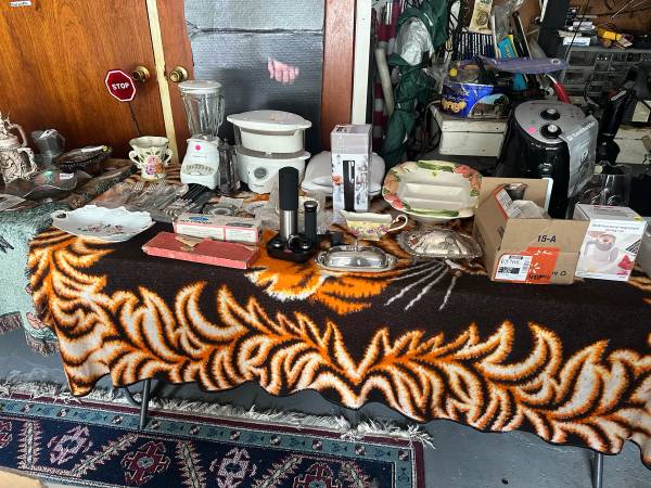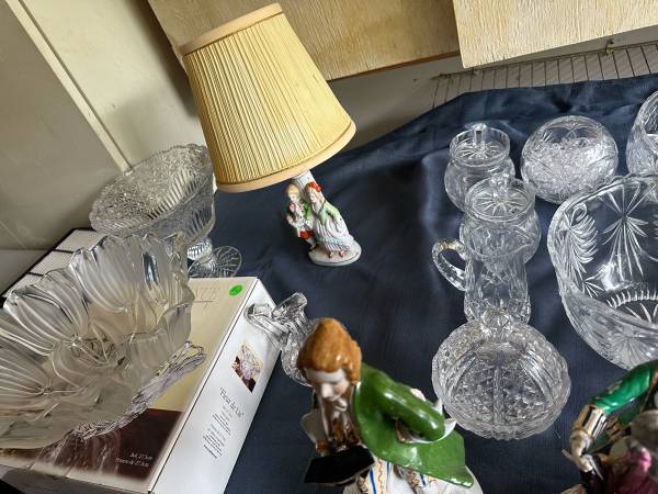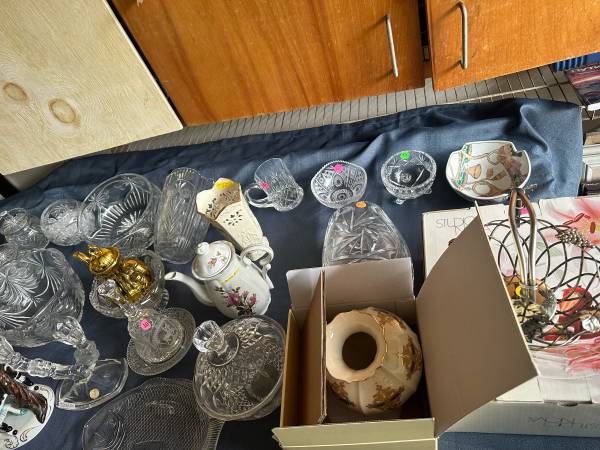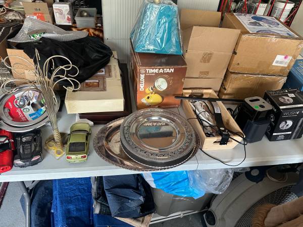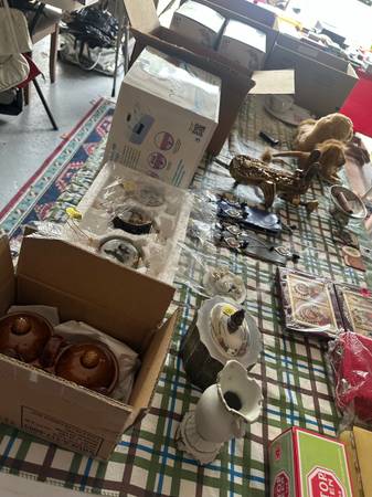 Antique, electronic, crystal, appliance, jewelry, books, vacuum cleaners, shoes,plants, purses, jewelry boxes a lot of more, can not make a lot of pictures, some tables is covered and will bring more. Everything has to go