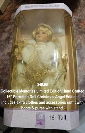 Collectible Memories Limited Edition Hand Crafted 16” Porcelain Doll Christmas Angel Edition. Includes extra clothes and accessories outfit with boots & purse with stand.