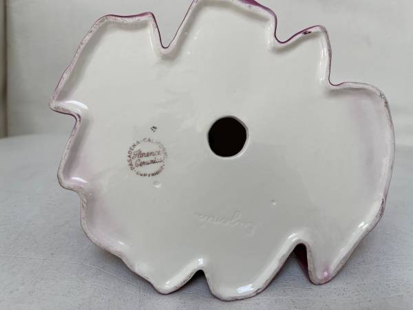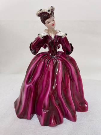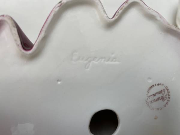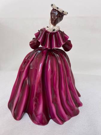 This vintage figurine `Eugenia’ was made by Florence Ceramics of Pasadena, CA. (The organization closed in 1977.) Eugenia has brown hair and is wearing a lush purple gown with elegant trim. She is...