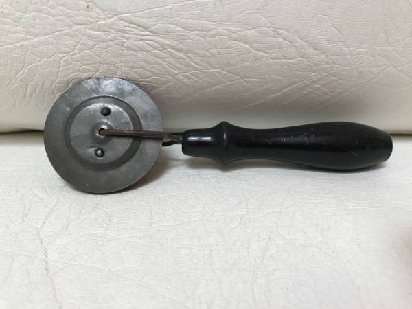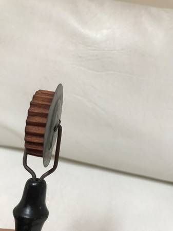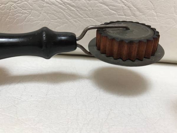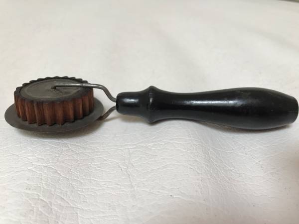 Vintage/Antique pie crimper and edger. Very unique – the crimper wheel itself is wooden. It seals the top and bottom crusts together into a fluted edge. The edger behind the wooden crimper wheel is...