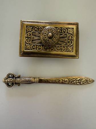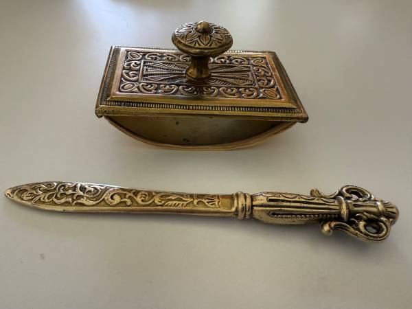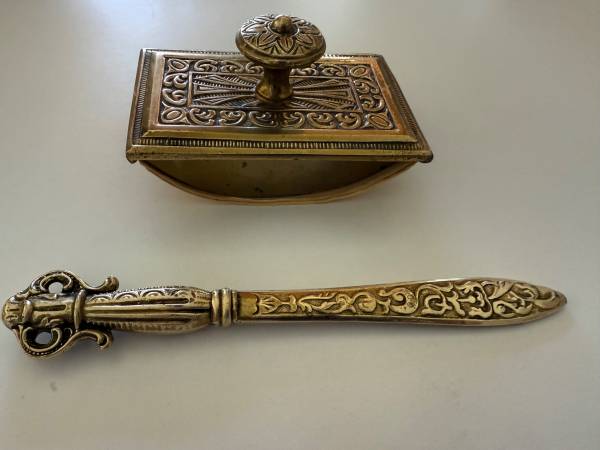 The vintage letter opener and blotter set is crafted from bronze, adding a touch of elegance to any desk. With its classic design and historical charm, this set is a perfect addition for collectors or those who appreciate vintage items. The opener and blotter are a functional yet stylish way to enhance your workspace or display area with a touch of nostalgia.