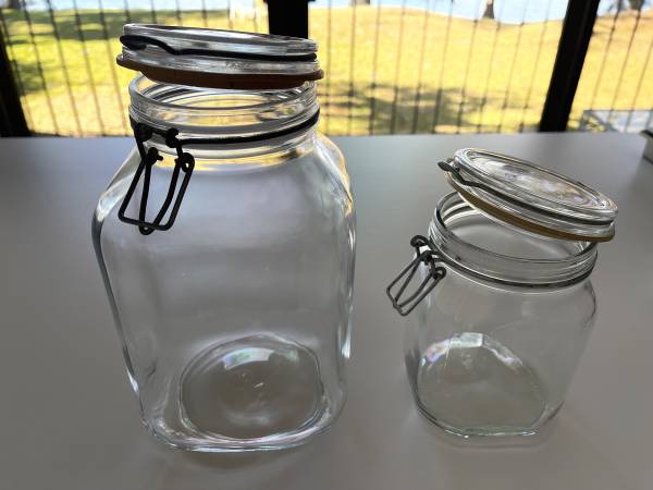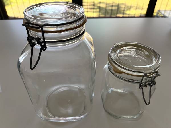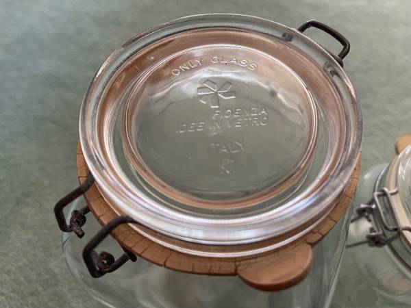 These vintage clear glass storage jars are labeled `I Vetri de Fedenza’ – Made in Italy. One is 3 liter; the other 1 liter. Each has a wire bail lid that locks. The 3 liter jar measures 9” to the...