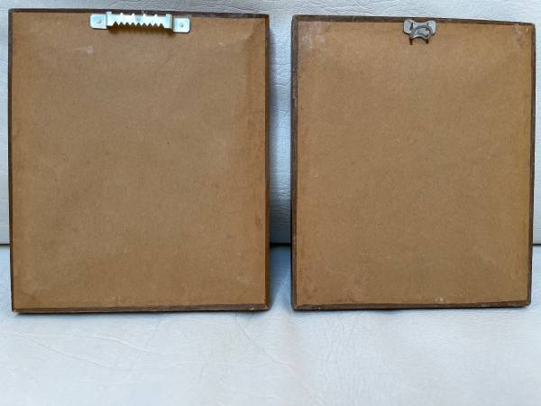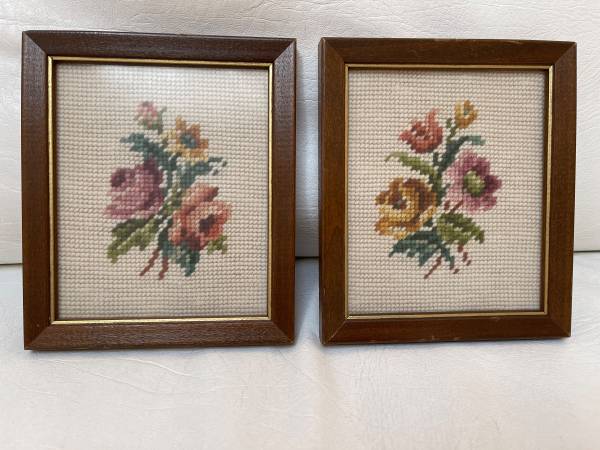 The needlepoints are under glass in wooden frames – ready to be hung or could be displayed on small easels.