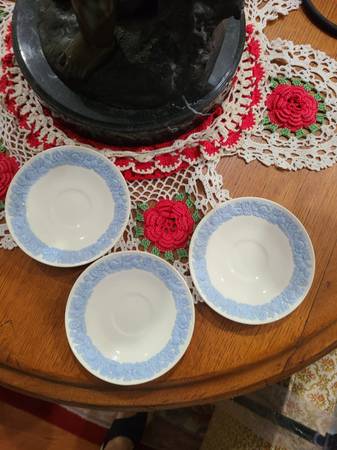 Flat pieces are 10 each, small box 30, larger box 35. No chips or cracks.please call.thank you clock is 20.front round flat dish has been sold. Also the 2 diamond dishes have been sold. I have added 3 small plates from wedgwood queens ware they are 20 for all 3.i also have a small wedgewood bell for 10.picture is what i have to sell now.thank you