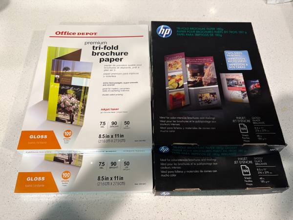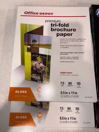 For inkjet and laser printers, there are two (2) boxes of HP and two (2) boxes of Office Depot brands tri-fold brochure paper.