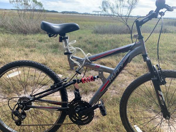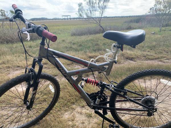 Huffy rock creek mono shock rear suspension front fork 26” tires caliber brake can deliver call David