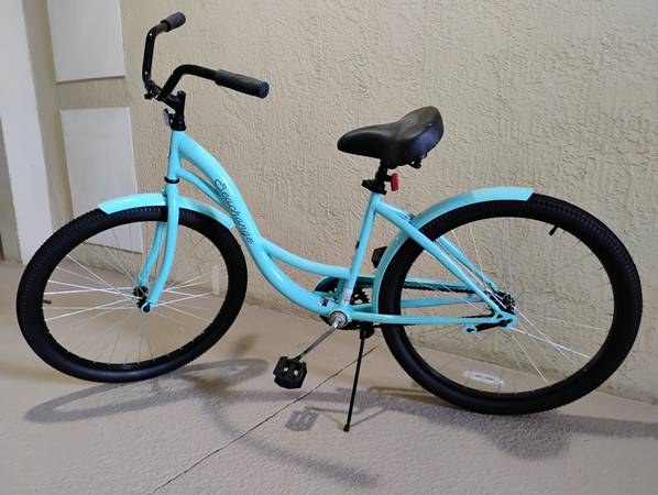 Equipped with tig welded steel frame. Stop on a dime with simple coaster brakes. Easy backpedal gives you a quick stop. Smooth cruiser tires, adjustable handlebar, soft rubber grip handles, adjustable deluxe padded seat - all make for a comfortable ride. Front and rear fenders keep you dry. Rust resistant lightweight alloy wheels, single speed drive train.
