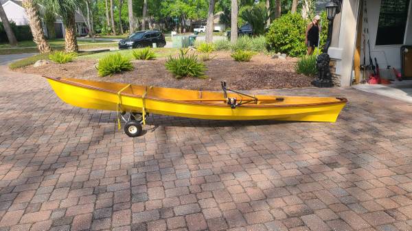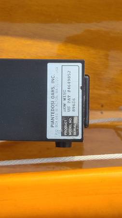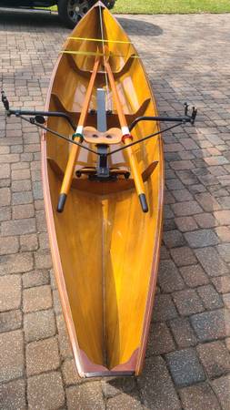 This slide seat pulling boat is ideal for the local waters. Not as fast as a single scull but more stable and quite forgiving. Handles boat wakes easily. This boat has been garage kept, comes with the classic Piantedosi Row Wing and wooden oars. The inside of the boat re-coated with West System epoxy and the outside hull with Pettit EZpoxy. Oars finished in Epiphanes spar varnish. All in good condition.