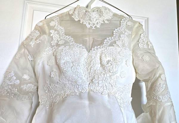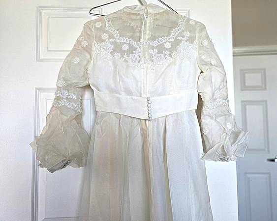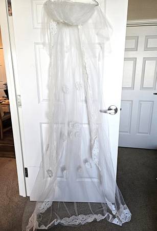 The dress measures about 30" around the waist and 54" from shoulder to bottom, not including the train. It fit someone 5'2" and 115 lbs.