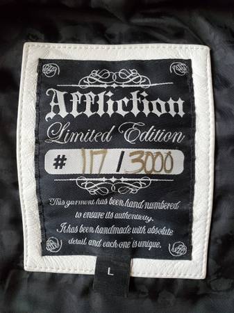 Low numbered limited edition 'Affliction' men's leather zipper jacket size Large. #117 of 3000 made. Every thing functions properly. Nice slightly worn condition. Over $850 new. SLIDE MAP FOR...