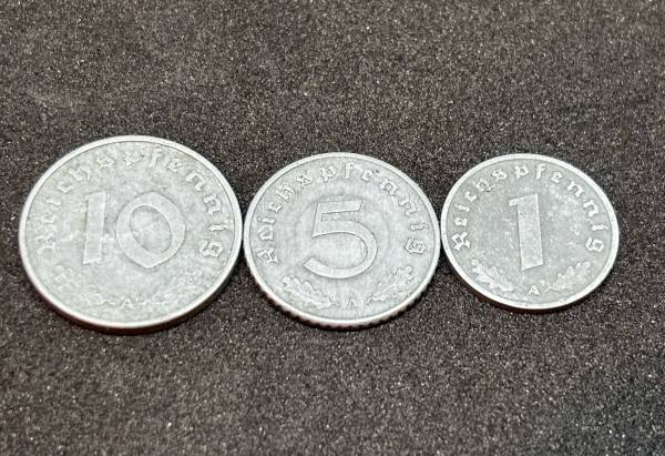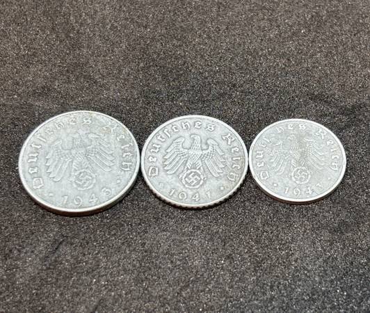 Nazi coins minted btw 1938-1944, coins are in very good shape. They are made of zinc. Denominations of 1-5-10 Pfennigs each coin set.Priced at $10 per set.