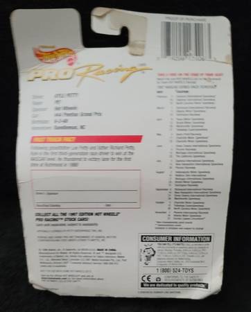 Hot Wheels Pro Racing 1997 #44 Kyle Petty Autographed. Die cast-body and chassis. Detailed interior. Deluxe rubber tires. Team PE2 Sponsor-Hot Wheels. #44 Pontiac Grand Prix. Birthdate 6-2-60. Hometown-Randleman, NC. Following grandfather Lee Petty and father Richard Petty, Kyle is the first third-generation race driver to win at the NASCAR level. He thundered to victory lane for the first time at Richmond in 1986!