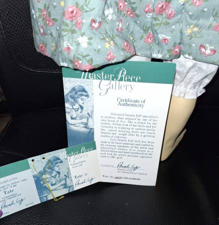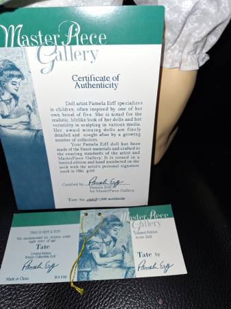 In original box this is Tate she is stunning with her long hair and lovely original outfit with a stuffed body. She is limited edition 350 /1000 dolls made . She is made by MASTERPIECE GALLERY DESIGNER IS PAMELA ERFF. SHE IS 26" INCHES TALL
