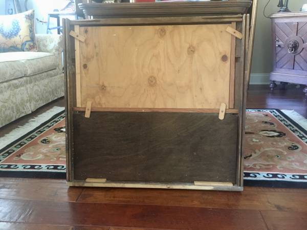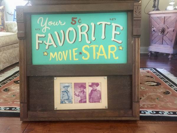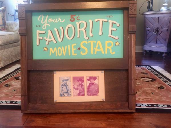This is a vintage advertising sign that was salvaged from Old Abilene Town, a tourist park in Texas with an old West theme that closed down in the 1970s. It was mounted above vending machines that sold souvenir photo cards of famous Hollywood cowboys for 5 cents. The upper part of the sign drew attention to the vending machines; the lower section contains 3 sample actual vintage photos that were in the vending machines. Sturdy wood frame is approx 27 x 29 inches.