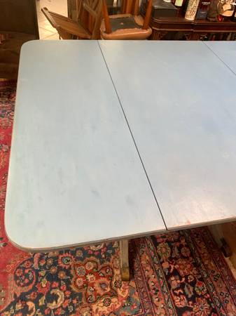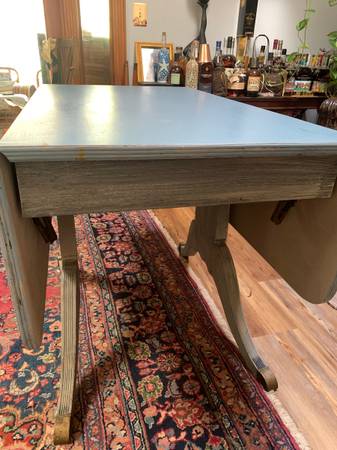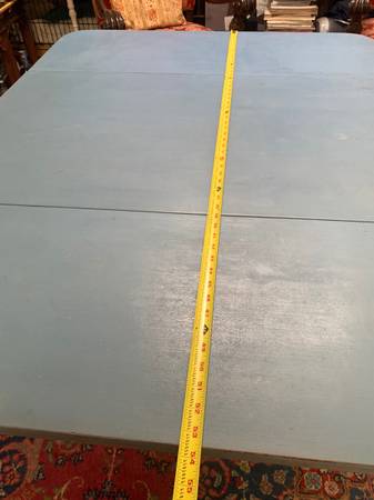 Painted blue, very sturdy and solid with collapsing sides to save space when not in use. The mechanism is very easy to use with a full size dining table ready in seconds. Extra table for any...