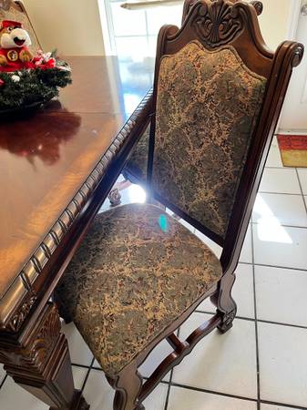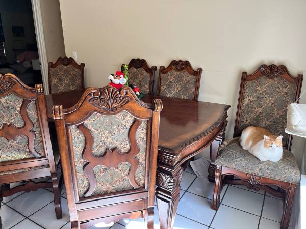 Solid wood table 72” with an 18” leaf with 6 comfy chairs for sitting