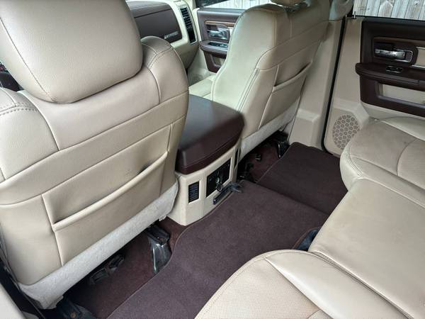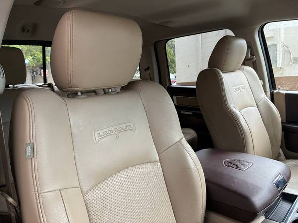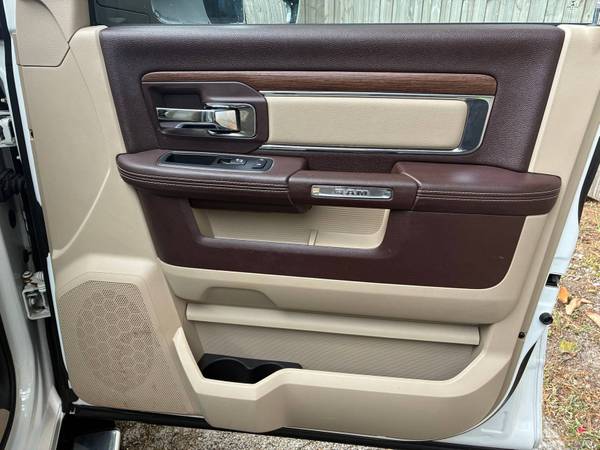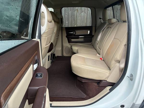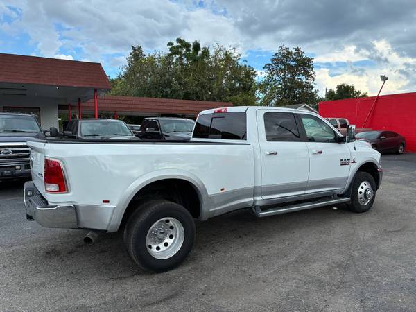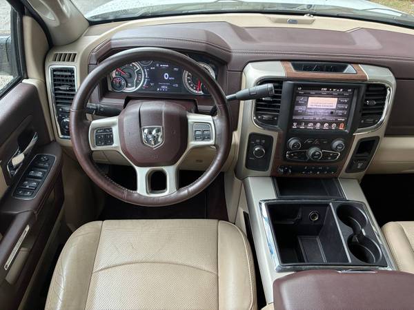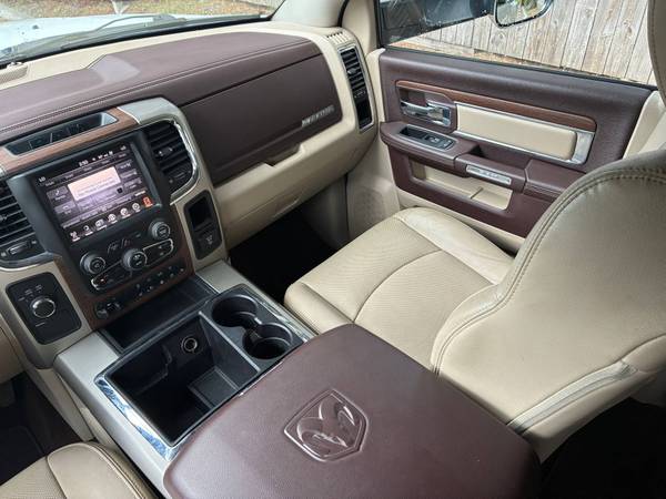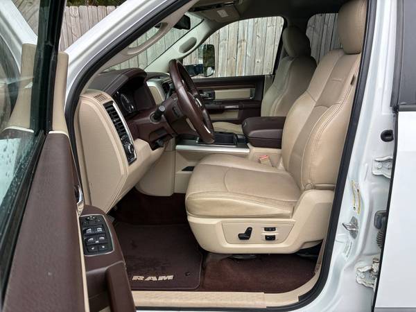 The 2014 Ram 3500 Laramie Crew Cab 6.7L Cummins TurboDiesel 4x4 Dually is a one-owner Southern truck that has been meticulously maintained with 16 documented service records. This heavy-duty pickup is in absolute mint condition inside and out, showcasing both rugged work capability and premium luxury. Powered by the legendary 6.7L Cummins TurboDiesel producing up to 385 horsepower and 850 lb-ft of torque, it is paired with a stout automatic transmission and dual rear wheels for maximum stability and hauling power. With a towing capacity exceeding 28,000 lbs and a payload capability well over 6,000 lbs (depending on configuration), this Ram is built to handle the toughest jobs while surrounding its occupants in upscale comfort. The Laramie trim brings leather seating, modern technology, and a refined interior that makes this dually equally at home on the jobsite or the open highway.