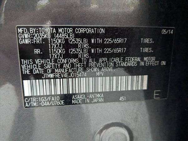 * Sun/Moonroof * Rear Spoiler * 50 State Emissions * Ash; Fabric Seat Trim * Magnetic Gray PearlCheck out this pre-owned 2014 Toyota RAV4 we recently got in. In their original incarnation, SUVs were chiefly owned by folks who valued utility above sport. Not anymore! The Toyota RAV4 XLE redefines the SUV and makes the perfect all around family companion. Everyone hates the gas pump. Skip a few gas stations with this super fuel efficient ToyotaRAV4. This is the one. Just what you've been looking for. More information about the 2014 Toyota RAV4: The RAV4 was one of the first modern crossover utility vehicles, and since its redesign in 2013, it's been redesigned to better fit the habits of its most common buyer-- families who want a fuel-efficient, reliable, easy-to-park vehicle. A capable all-wheel drive system makes the RAV4 a smart pick for those needing to commute through snowy winters or a trip to the mountain. Interesting features of this model are fuel-efficiency, Roomy interior for a compact SUV, safety features, upgraded connectivity and audio systems, and capable all-wheel-drive system