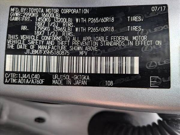 * Navigation Package * Blind Spot Monitor W/Rear Cross Traffic Alert * Sun/Moonroof * Intuitive Parking Assist * Navigation System * 3rd Row Seat * Paint Protection Film By 3M * Preferred Accessory Package * Keyless Start * Rear Spoiler * Sepia; Nuluxe Seat Trim * Silver Lining MetallicThank you for your interest in one of AutoNation USA Jacksonville's online offerings. Please continue for more information regarding this 2017 Lexus GX GX 460 with 107,150mi. This SUV gives you versatility, style and comfort all in one vehicle. This Lexus GX GX 460's level of quality is not meant for just anyone. It's meant for the person who strives for a classy, comfortable, and luxurious car. This 4WD-equipped vehicle will handle beautifully on any terrain and in any weather condition your may find yourself in. The benefits of driving a 4 wheel drive vehicle, such as this Lexus GX GX 460, include superior traction and stability. In addition to being well-cared for, this Lexus GX has very low mileage making it a rare find.