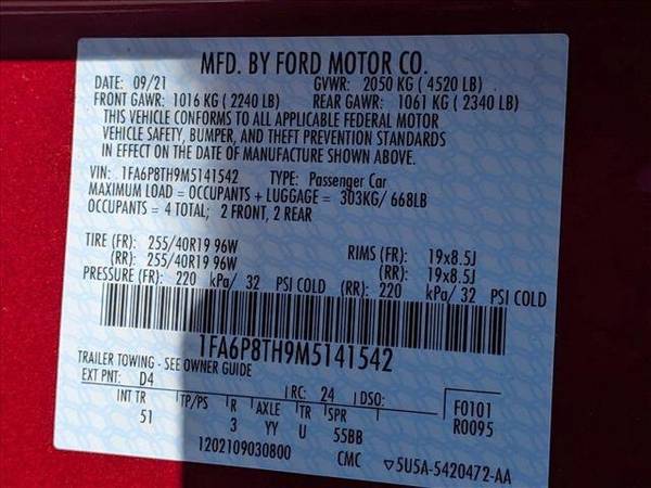 * Equipment Group 201A * Transmission: 10-Speed Selectshift Automatic * Wheels: 19" X 8.5" Polished Aluminum * Active Valve Performance Exhaust * Radio: B&o Sound System By Bang & Olufsen * Ford Safe & Smart Package * Leather Seats * Navigation System * Mini Spare Wheel & Tire * Rapid Red Metallic Tinted Clearcoat * Lane Keeping Assist * Keyless Start * Rear Spoiler * Cooled Front Seat(S) * Ebony/Metal Gray Stitch; Leather-Trimmed Bucket Seats W/Color Accents * Engine: 2.3L EcoboostLooking for a clean, well-cared for 2021 Ford Mustang? This is it. This Ford includes: ENGINE: 2.3L ECOBOOST (STD) 4 Cylinder Engine Gasoline Fuel Turbocharged *Note - For third party subscriptions or services, please contact the dealer for more information.* The Mustang EcoBoost Premium is well maintained and has just 12,436mi. This low amount of miles makes this vehicle incomparable to the competition. The quintessential Ford -- This Ford Mustang EcoBoost Premium speaks volumes about its owner, about uncompromising individuality, a passion for driving and standards far above the ordinary. You've found the one you've been looking for. Your dream car.