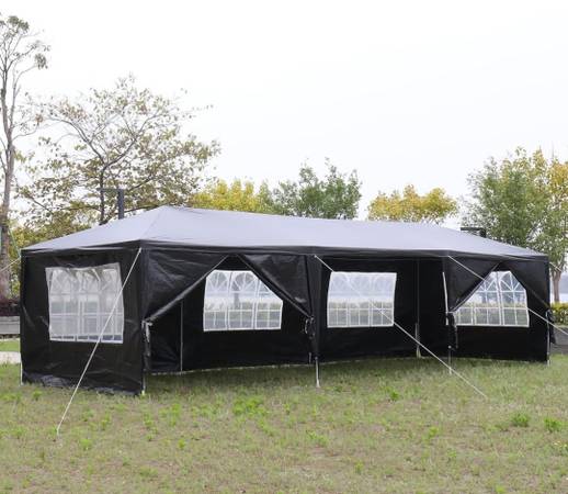 Brand New still in box Black 10ft X 30ft canopy tent. Includes 2 - zippered doors and 8 removable walls. Works great for parties or weddings and other special events on a sunny day day. Some assembly required.