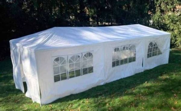 This unit is a complete setup kit. It is Brand New in box - never opened or used. The tent is 10ft x 30ft outdoor Party Canopy. This includes an all metal frame, 7 fully removable sides walls, metal ground anchors + tie down rope. Great for sunny weather events. This is not a pop up. Some assembly required. Non smoking home.