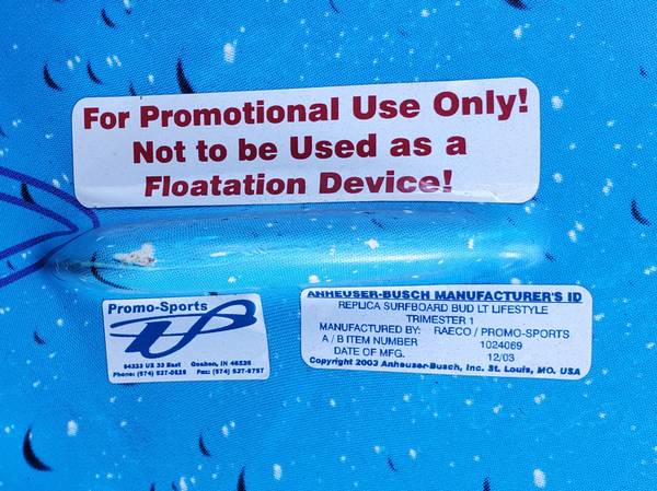 Life size 5'8" Bud light advertising faux tri fin Surfboard wall hanger. Hollow plastic. 20"s W x 2"s thick. $45. SLIDE MAP FOR LOCATION. UNIVERSITY AND ATLANTIC HART BRIDGE AREA. Thanks Beach321