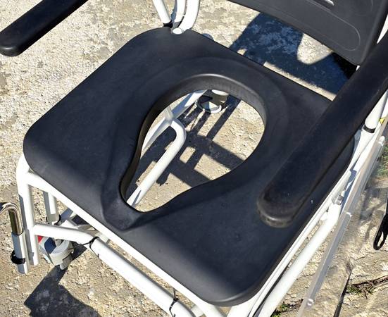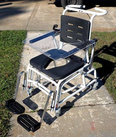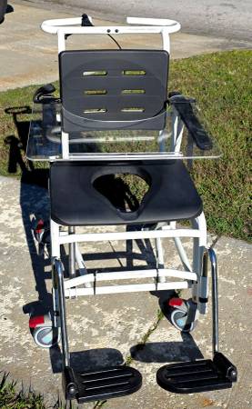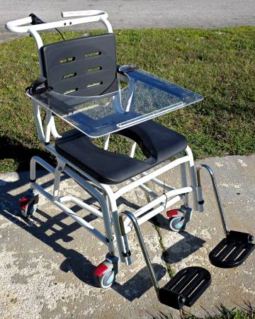 Rolling Shower & Commode Chair with Tray - Clean/Good Condition This mobile shower/commode chair is in very good condition, clean and ready for immediate use. Versatile: Can be used as a shower...