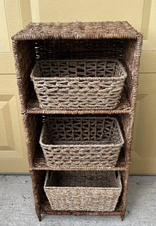 3 Tier natural hyacinth standing shelf with 3 baskets 30” x 14” x 10” deep $30 NOT NEGOTIABLE Collins road 32244 pick up location Jacksonville westside