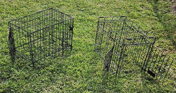 Small Double Door Portable Animal Crates. Foldable and made out of heavy-duty metal. Comes with removable bottom tray for any accidents. Easy to set up and store. No tools needed. Two doors. One on the front and one on the side. I have 2 of 2 left. Measures 22"L X 13" W X 15" D. These sell for $45.00 each brand new. They are $40.00 each.