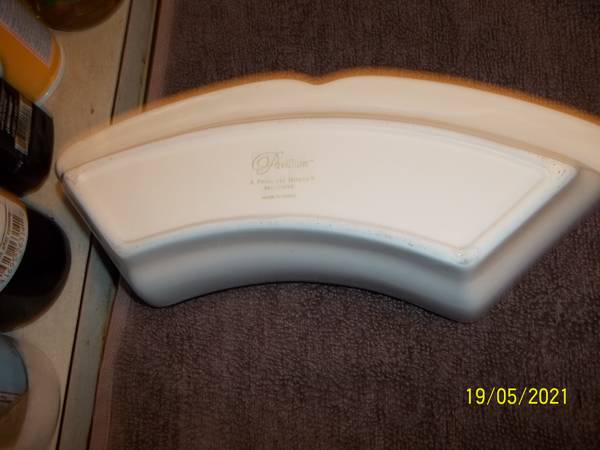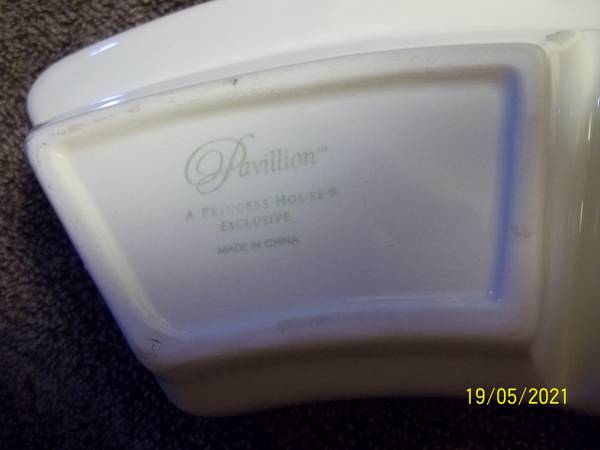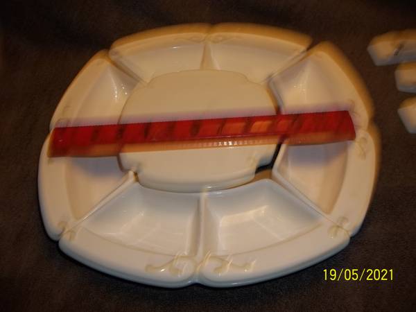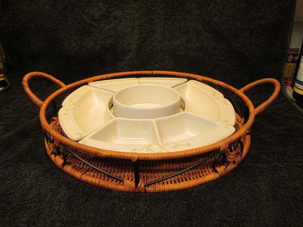 I have this Princess House Pavillion Divided Serving Platter With 4 Relish Dishes & Bowl, sitting in a wicker carrying basket.