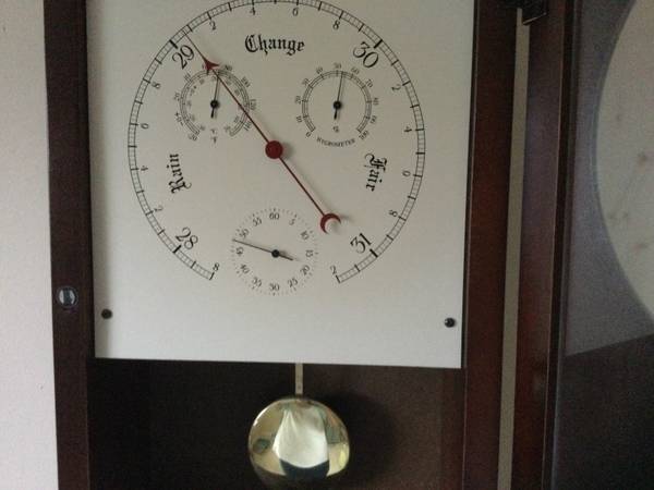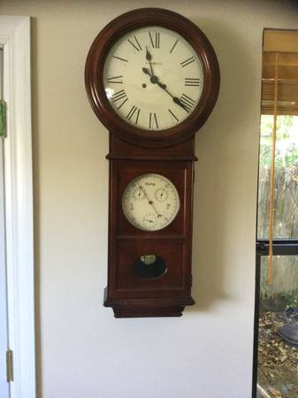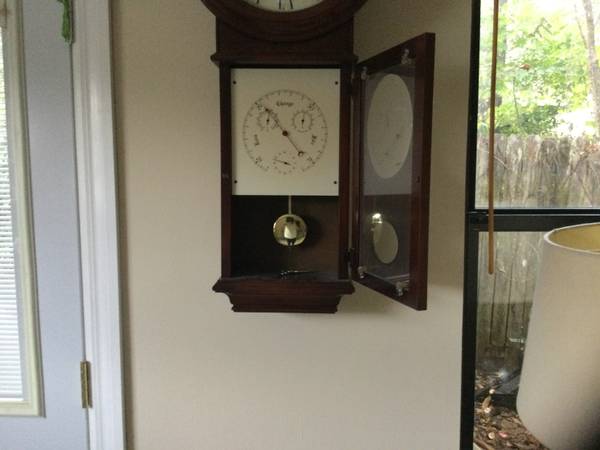 Beautiful wood, mint condition barrister wall clock. Pendulum, chime with switch on or off. Temperature, humidity, barometric pressure and seconds display. Wonderful gift, well below current retail.