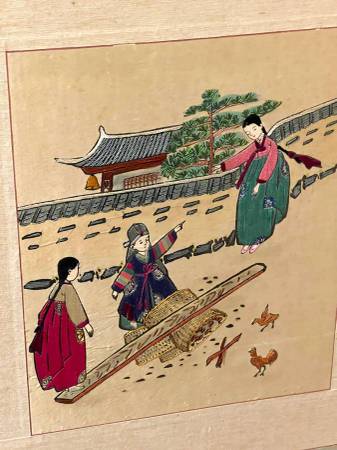 A decorative piece, with charming romanticized depictions of life in Old Korea. Each panel measures about 49" tall and 16-1/2" wide. They are about 3/4" inch thick. Screen is very faded and has water stains in places and some of the stitching in places has come loose. The fronts are in overall fair condition, just not taken care of properly. The back is another story and I would say backs are in poor condition. There is tearing on back paper and on one place (shown in pic) you can see the paper used as padding.