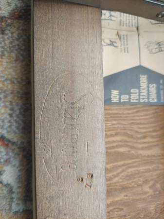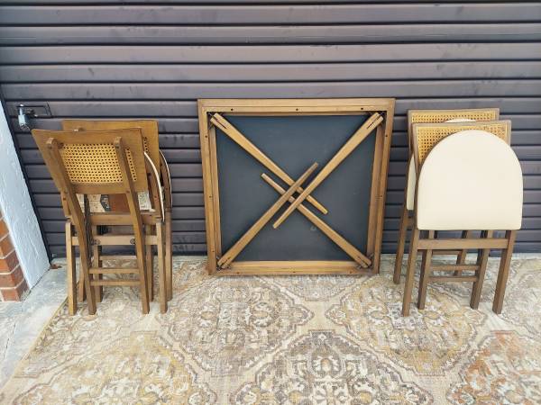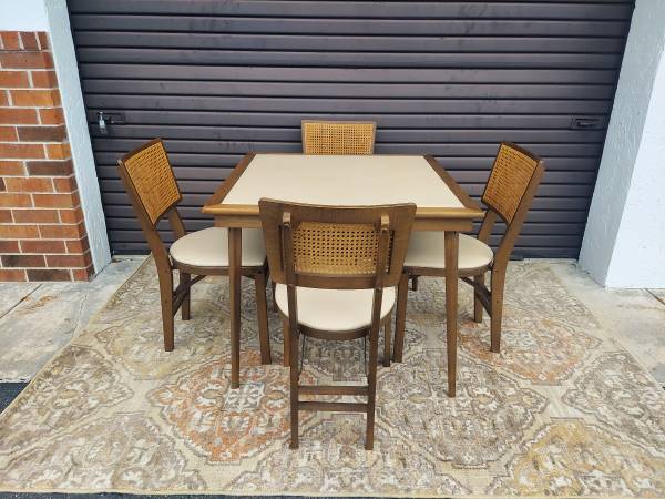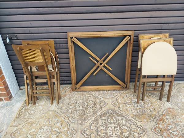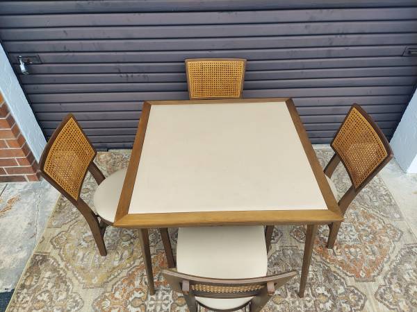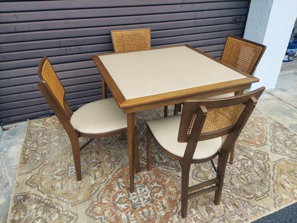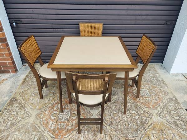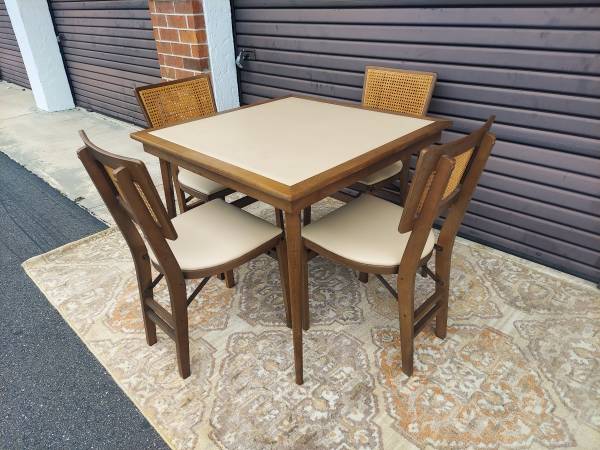Century Stackmore 5 Piece Bridge Table and Four Folding Chairs - Lovely Cream Color Vinyl Padded Top - Chairs with Curved Caned Back and Matching Cream Color Padded Seats - Very Good Gently Used Condition - Made in USA. Oswego, Tioga County, NY. Measures Table 35" x 34" Square and 28" Tall. Chairs 16" Wide x 17" Depth and 32" Tall. Seat 17 1/2" Tall. Price $450.00. Cash Only. For More Info Call 386 eight four eight six two two 4 or Texts.