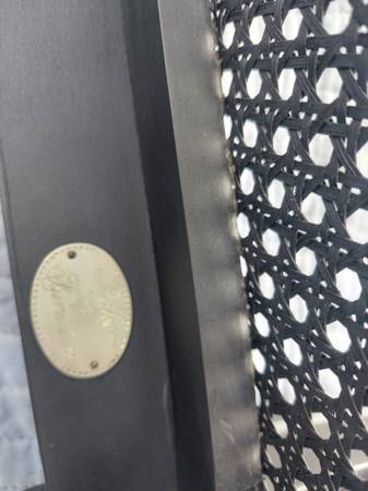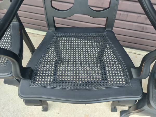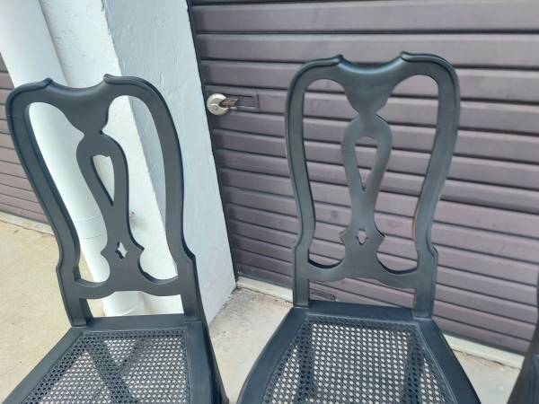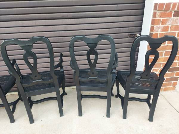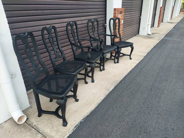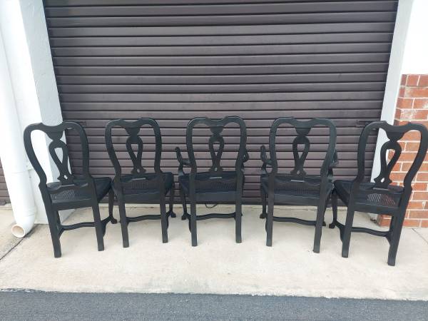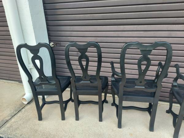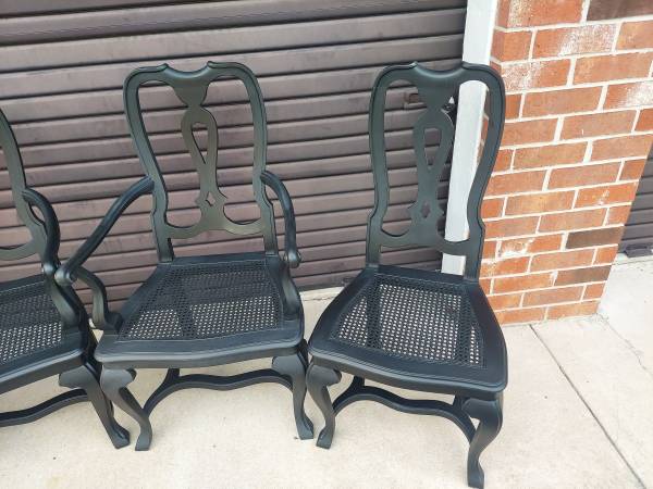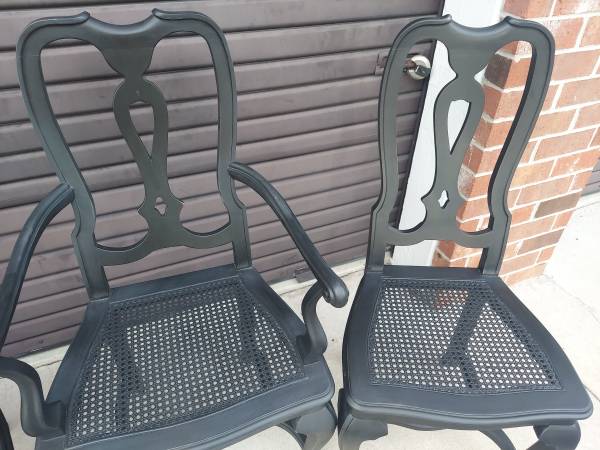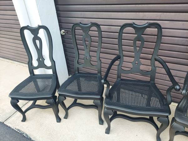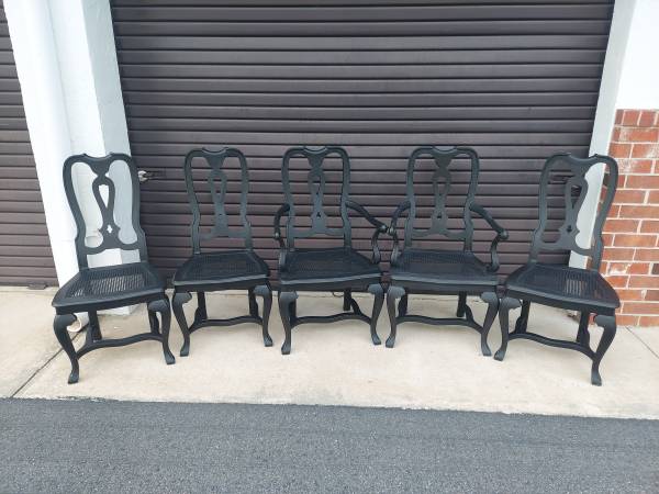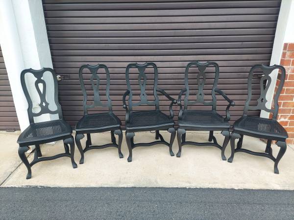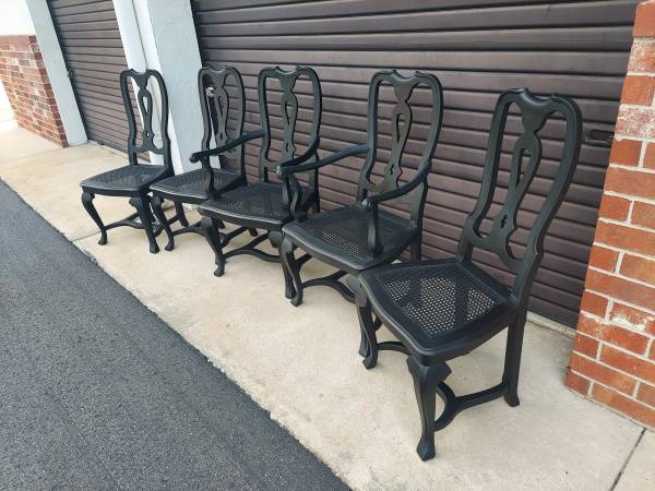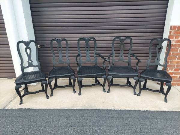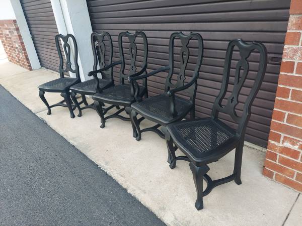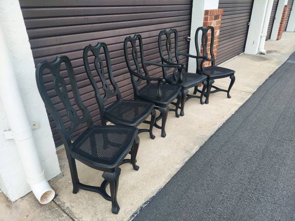 Set of 5 Baker Furniture French Style Dining Chairs with Cane Seats - 2 Armchairs and 3 Side Chairs - Black Painted Finish - Beautiful Details - Finnest Quality - Very Good Vintage Condition - Measures 2 Armchairs 23 1/4" Wide x 17 1/2" Depth and 40 1/2" Tall. Seat 17 1/2" Tall. Side Chairs 19 1/2" Wide x 16 1/2" Depth and 40 1/2" Tall. Seats 17 1/2" Tall. Price $595.00. Cash Only. For More Info Call 386 eight four eight six two two 4 or Texts.