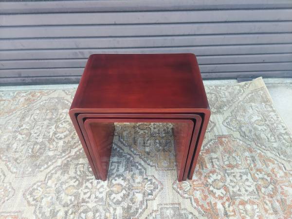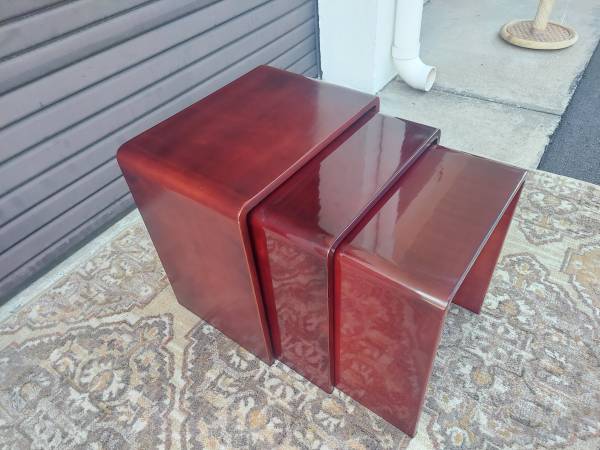 Set of 3 Mid Century Laquered Nesting Tables By Rae Kasian - All Are Signen Underneath - Top One Has What Appears Be a Slight Sterss Crack Which Has Been There For Many Years - Very Good Condition - Color is Dark Red Mahagany - Measures Large Table 20" Weide x 14" Depth and 21" Tall. Medium Table 18" Wide x 14" Depth and 20" Tall. Small Table 16" Wide x 14" Depth And 19" Tall. Price $475.00. Cash Only. For More Info Call 386 eight four eight six two two 4 or Texts.