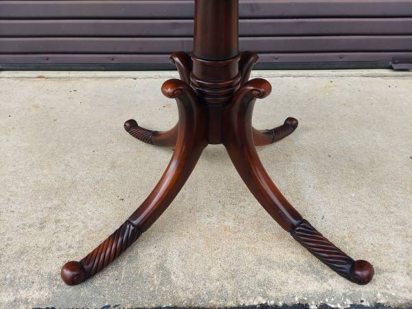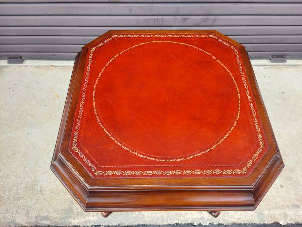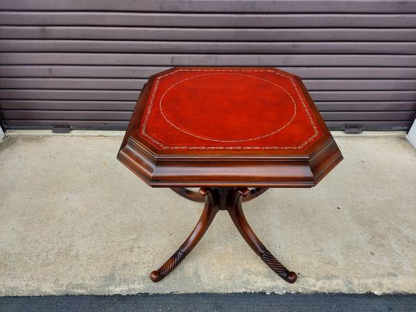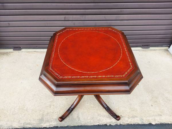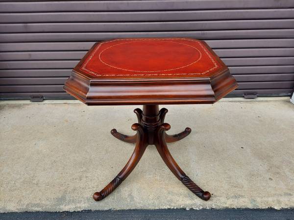 Vintage English Regency Table with Red Leather Top - High Quality No Marker Mark - All Original - Solid and Sturdy - Lots of Interesting Detail - Nice Original Condition - Maybe Have Some Imperfections Due to Age or Use - From No Smoking Home. Measures 27 1/2 Square x 28" Tall. Price $199.00. Cash Only. For More Info Call 386 eight four eight six two two 4 or Texts.